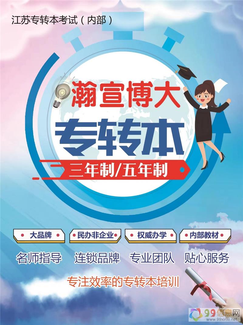 江苏瀚宣博大专转本辅导班主要辅导对象:江苏无锡、南京、常州、扬州、南通、宿迁、淮安、盐城、泰州、连云港、淮安、苏州、镇江五年制大专院校学生,其根据考试大纲,系统分科目详细讲解各个部分的内容,通过老师的课堂教学,进一步加深各科的内容,起到提纲挚领的作用,在整个教学过程中,将往年考试内容贯穿其中,一方面让学生掌握了基本考点,另一方面在重点内容上进行强化,促进学生取得高分,升入理想院校www.99xinxi.net。